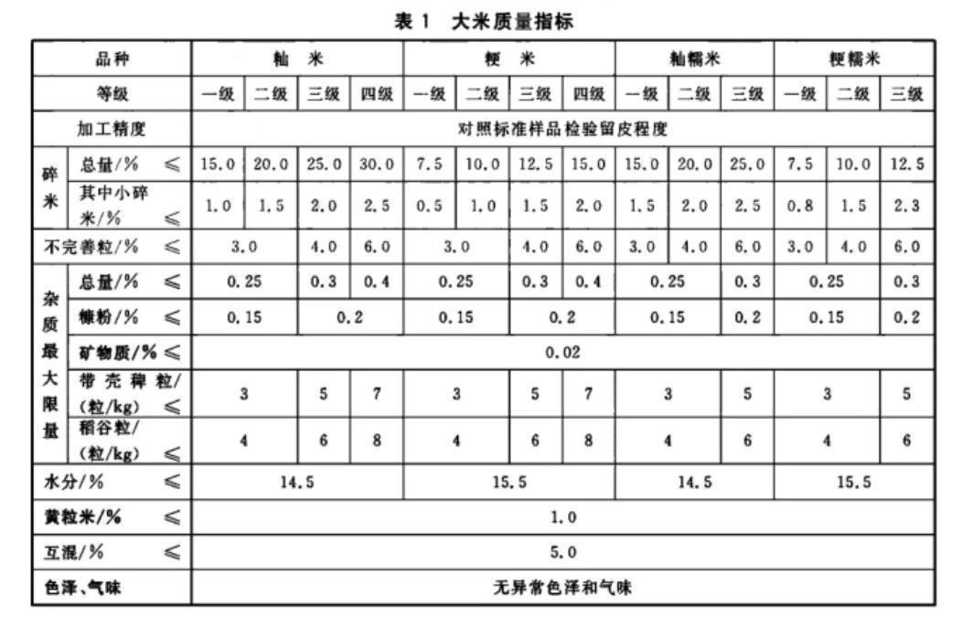 r在我国,无论是国产的还是国外进口的大米,都必须符合GB/T1354的标准。在质量指标层面,GB/T1354对大米的加工精度、碎米含量、不完善粒含量、水分含量、杂质含量等进行了详细规定,从而保障了大米的基本品质,是大米的通用执行标准。